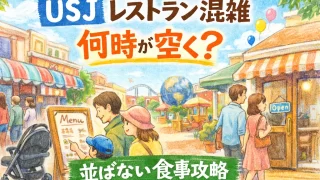USJのレストランは時間帯次第で待ち時間が大きく変わります。空いている時間帯・混雑ピーク・比較的入りやすい穴場店舗をまとめて解説。食事の待ち時間を減らしたい人必見。